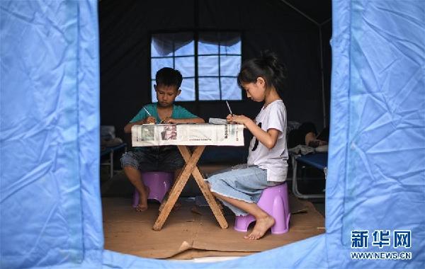 6月23日,在四川省宜賓市珙縣僰文化廣場安置點,兩名小朋友在帳篷內(nèi)學(xué)習(xí)。新華社記者 薛玉斌 攝